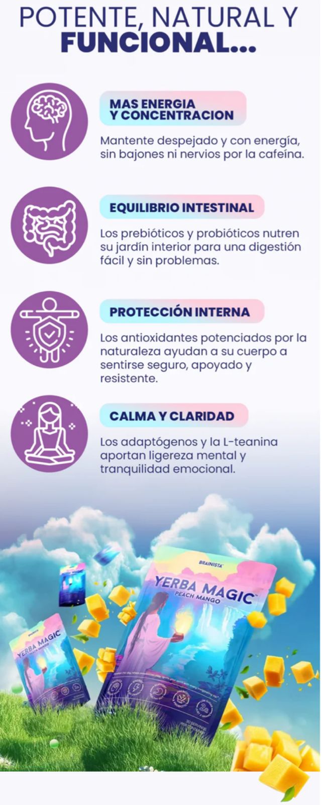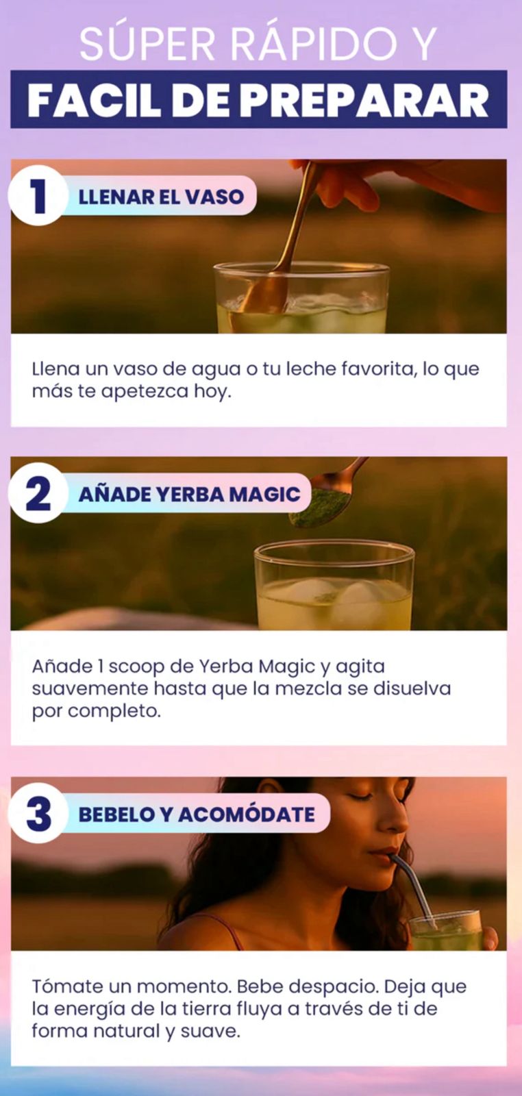 Sí contiene cafeína natural, pero en niveles 90% más bajos que un café. A diferencia de los picos de energía del café, Yerba Magic® proporciona una energía sostenida sin choques ni nerviosismo, gracias a los compuestos naturales de la yerba mate.